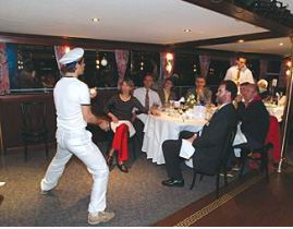 第二天晚上的節目是泛舟美麗的多瑙河,各國嘉賓們在豪華的游艇上邊享用豐盛晚宴,邊欣賞沿河的美景,隨著習習夜風,有著名的藍色多瑙河圓舞曲的一路陪伴,間或欣賞席間的小表演和雜耍,貴賓們充分感受到了Voith人的熱情。