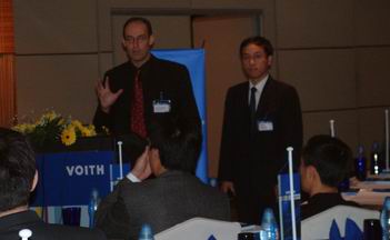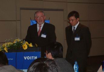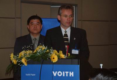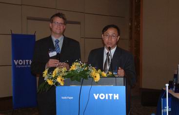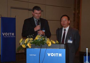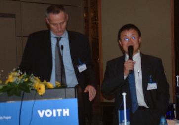 板紙和包裝紙機(jī)區(qū)域銷售經(jīng)理Werner Wiedenbauer分別中國區(qū)與應(yīng)用與銷售經(jīng)理印世德和何國亭做《瓦楞原紙和箱板紙的優(yōu)良性能》、《DF式涂布機(jī)——一項(xiàng)新的紙板涂布技術(shù)》報(bào)告。