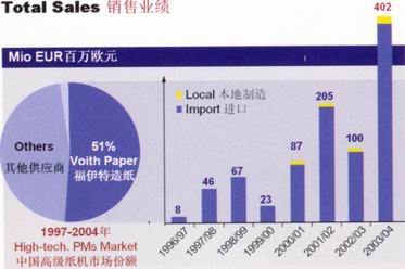 福伊特造紙中國的銷售總額顯著增長,其本地制造供貨部分也大幅增長。在2003/2004財年,中國銷售總額達(dá)到歷史性新高點(diǎn)4.22億歐元(42億人民幣),其中在中國本地制造和供貨的部分也達(dá)到了11OO萬歐元(1億人民幣)。隨著這些驕人的業(yè)績,在中國高新技術(shù)造紙機(jī)市場,福伊特造紙在高檔紙機(jī)方面獲得高達(dá)51%占有率,成為中國最大的高技術(shù)造紙機(jī)供應(yīng)商。