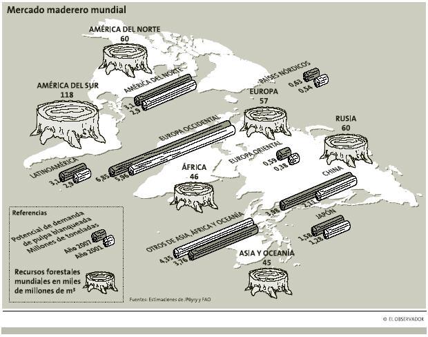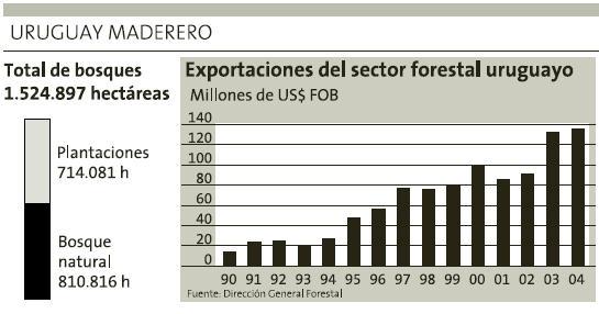 烏拉圭的人工林主要集中在RIVERA、TACUAREMBO、RIONEGRO、PAYSANDU以及東部山地。桉樹(GLOBULUS和GRANDIS兩個(gè)品種)和松樹占了80%。GLOBULUS按樹10年后就可砍伐,而GRANDIS按樹和松樹則在生長15-20年后方可成材。烏拉圭現(xiàn)有的人工林從2006年開始可以成片砍伐。