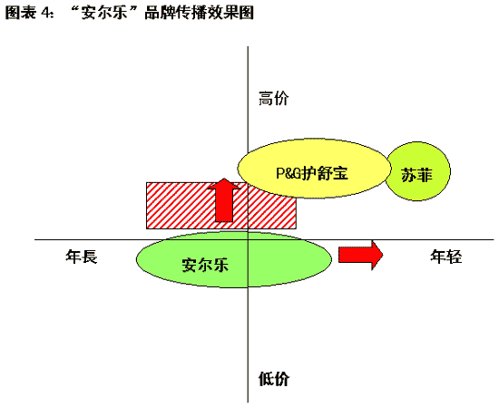 面臨市場內外的全方位競爭,經過審慎調研和精心策劃,恒安集團決定實施品牌差異化戰略,以“安爾樂”子品牌“七度空間”引領市場!捌叨瓤臻g”子品牌的基本定位是:以速滲、高吸收、抗菌、透氣、纖薄、防側漏、舒爽等年輕女性,尤其是現代都市白領女性所關注的衛生巾產品七方面功能為出發點,幫助她們樹立追求時尚、追求完美的“細節完美主義”的生活觀點,感受作為一個女人被人全方位照顧的喜悅。同時,提煉出“七重防護,全效照顧”的產品核心概念,全方位運用整合品牌傳播手段推動“安爾樂”品牌整體形象提升,將“安爾樂”同中低檔品牌區隔開來,打造成能與“護舒寶”、“嬌爽”等洋品牌抗衡鼎禮的大品牌。(見圖表4)