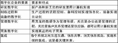 一、 企業(yè)領導者要站在一定高度上看待信息化問題,正確認識什么是信息化。信息化不只是ERP,更牽扯到管理結構、觀念上的變革。因此,選型時要有特色,要從基礎架構和管理方式上都比競爭對手強,這樣才能使信息化從一開始就處于比較有利的位置。董鷹認為,做信息化的實質(zhì)是“數(shù)字化企業(yè)”,而表1是他所列的數(shù)字化企業(yè)的要素。