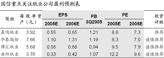 維持對(duì)行業(yè)“中性”的投資評(píng)級(jí),維持晨鳴紙業(yè)“推薦”的投資評(píng)級(jí),維持對(duì)華泰股份、岳陽(yáng)紙業(yè)和博匯紙業(yè)“謹(jǐn)慎推薦”的投資評(píng)級(jí)。