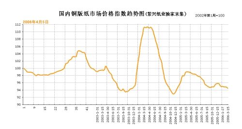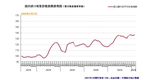最近關于紙業利潤水平下降的報道比較多,國家信息中心發布的第一季度紙業數據表明,造紙行業一季度全行業累計實現工業總產值662.3億元,同比增長28.8%,一季度全行業累計實現利潤24.48億元,同比增長11.9%,增速比2005年下降14個百分點。同時,行業虧損增多,虧損企業虧損額同比增加67.34%,大大超過2005年同期和全年的水平;國信證券研究所的一份報告指出,行業開工率由05年末的79.9%下滑至本季末的74.7%,紙業表現為階段性產能過剩;消費日報一篇專稿披露,新聞紙市場價格從去年的每噸5500元下降到當前的4800元。而銅版紙產品的價格也一樣不容樂觀,根據中國紙網發布的價格指數,最近一段時期以來,銅版紙產品的價格趨于走低,而其原料闊葉木漿的價格卻不斷提升(見下圖)。價格走低而成本加大,很多造紙企業正面臨著被前后夾擊的困境。難怪有網友提問時說“紙業的形勢不太好啊,說說下一步的趨勢吧”。
