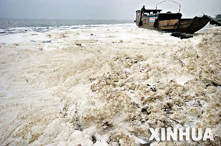 沅江紙廠在南洞庭湖排出的污水泡沫氣味刺鼻