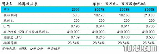 根據公司擴張速度的假設,我們調整了公司的盈利預測,預計07-09年收入分別為1690.7、2864.5和3344.3百萬元,同比分別增長72.58%、69.43%和16.75%;凈利潤分別為102.78、182.68和210.88百萬元,同比分別增長76.3%、77.74%和15.44%,每股收益分別為0.344、0.611和0.705元。但是考慮到公司公開增發不超過1.2億股,攤薄后的每股收益則分別為0.245、0.436和0.503元,即攤薄了28.64%,攤薄作用相當明顯。