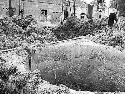 這家造紙廠是侯屯村的集體企業(yè),廠房四周全部是農(nóng)田。生產(chǎn)車間里,幾臺機(jī)器轟鳴著,制出的黃板紙卷成一個個大圓桶,堆放在一邊,幾名工人在照看著正在運(yùn)轉(zhuǎn)的機(jī)器。鍋爐房東側(cè)是一堆堆小山似的麥秸稈,十幾名工人正在將麥秸稈向一臺機(jī)器上投送,旁邊8個洗漿池里堆滿了大量的草漿。洗漿池外,一只小碗口粗的鋼管向外噴出濁黃的廢水。廠區(qū)南側(cè),有一片大的污水存放池,池內(nèi)存滿了造紙廢水。