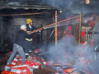 19日晚21時19分,建甌消防大隊119值班室接到群眾的報警后立即出動了三部水罐車和一部指揮車奔赴火場。大隊官兵趕至現場后發現滾滾濃煙籠罩著整個廠房四周,空氣中彌漫著嗆人的焦味,污水淌了一地。所幸火勢只是相對控制在用竹木簡易搭蓋的倉庫內,沒有迅速向四周蔓延。大隊官兵立即展開戰斗,出兩支水槍進行壓制滅火。不到20分鐘,外圍的火得到了控制,可數萬只紙箱層層疊疊捆扎在一起擠滿了整個倉庫,表面上看似乎沒有明火,可內部的火仍然燒得正旺,嗆人的濃煙熏得人喘不過氣來。見此情景,火場指揮員立即指揮廠內員工協助戰士手持火鉤、鐵鏟等工具,從各個方向將倉庫內存放的紙箱分為已燃和未燃扒到空曠地上,以便水槍手能對紙箱堆垛內層進行掃射。歷時3個多小時,大火被徹底撲滅。