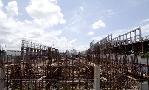7月15日,工人在洋浦金海漿紙廠160萬噸造紙項目工地施工