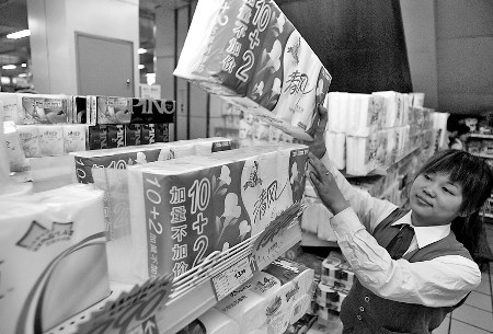 29日,記者在山東濟寧城區的一家超市內看到,由于庫存商品尚未售完,衛生紙、手帕紙等產品的價格尚未上漲,很多市民趁著這個時機趕緊出手購買,其中,一線品牌的促銷商品尤其受到市民青睞。