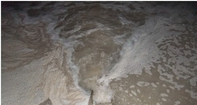 借助手電的光亮,記者看見乳白色的紙廠污水從一個(gè)已經(jīng)有些破損的水泥管道中噴涌而出,管道周邊的水面上泛起大面積白色的泡沫。下堤之前帶路的村民告訴記者,這里曾發(fā)生過兩次“爆炸”,原因是排出污水的水壓過大,致使水泥管的管口兩次被崩裂。
