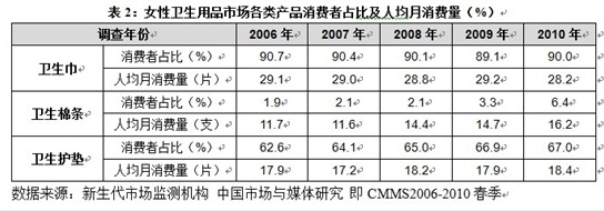 女性衛生用品市場以及嬰兒衛生用品市場,由于滿足特定人群的特殊需求,目前市場基本穩定,變化不明顯;衛生棉條作為新的產品類別,雖然在國外有較好的市場前景,但目前國內需求尚未顯現,發展較為緩慢,未來需要更多刺激消費者需求,擴大市場銷量;衛生護墊市場,由于消費需求有限,以及替代性產品的出現,增長潛力非常有限。