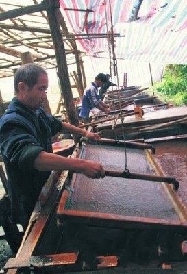 在貴州丹寨縣城北40公里一個叫石橋的地方,至今仍保留著從古代流傳下來的一種造紙術:以樹皮為精,構樹葉為華,山泉為媒,手工而成。一張張看似粗糙的“古紙”,漂洋過海,銷到了世界40多個國家和地區,也成為國家圖書館修補文獻和茅臺酒商標包裝的主要用紙。