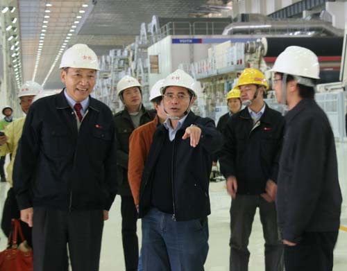 潘文峰一行參觀了造紙車間后,對全長523米的白卡造紙機表示贊賞,該紙機從德國福伊特公司引進,設計車速1400米每分鐘,凈紙寬8.1米,是目前世界上最大的機內涂布白卡造紙機。該紙機不日將投入調試運行。