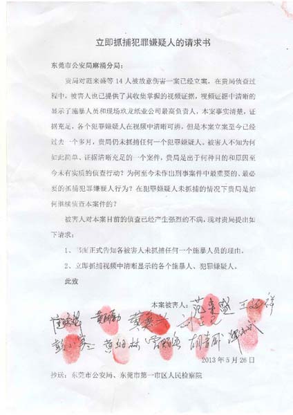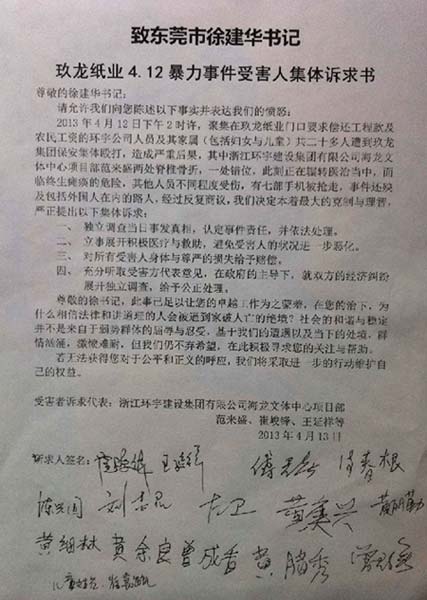 致東莞市徐建華書記:關于玖龍紙業4.12暴力事件受害人訴求書