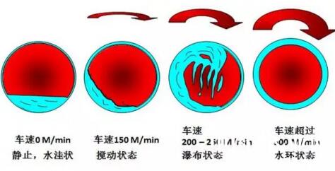 蒸汽通過旋轉接頭進入烘缸內釋放出汽化潛熱后形成冷凝水,冷凝水在烘缸內的運動狀態隨著烘缸直徑和車速有著如下的狀態,見下圖