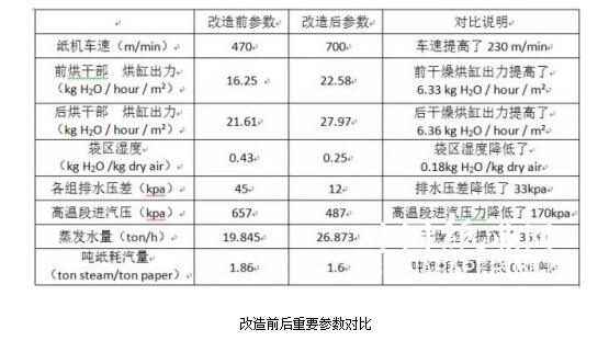 經過烘干部系統改造以及紙機其他關鍵部件的改造,目前車速提高至700m/min,系統改造前生產中平均每小時能夠從紙頁中蒸發19.845噸水分,改造后在該紙機每小時能夠蒸發26.873噸水分,比改造前提高了35%,即意味著改造以后,該紙機烘干部的干燥能力提高了35%。