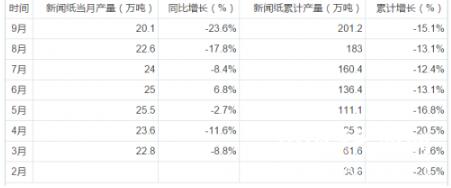 據(jù)前瞻數(shù)據(jù)庫顯示,2017年9月,中國新聞紙產(chǎn)量20.1萬噸,同比下滑23.6%;2017年1-9月,中國新聞紙行業(yè)累計產(chǎn)量201.2萬噸,同比下滑15.1%。以下為2017年1-9月中國新聞紙行業(yè)產(chǎn)量數(shù)據(jù)統(tǒng)計: