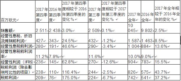 斯道拉恩索首席執行官宋思倫(Karl-HenrikSundström)對2017年第四季度業績發表評論: “在轉型成為可再生材料成長型企業的道路上,我們達到了新的高度。公司的轉型非常成功。2017年,我們的總銷售額超過了100億歐元,我們的經營性息稅前利潤也超過了10億歐元。與此同時,我們加強了自身在未來生物經濟領域的領導地位。 我們連續第四個季度實現銷售額的同比增長,第四季度的銷售額增幅達到了3.0%。除去紙張業務,銷售額增長了6.2%。這主要歸因于北海、瓦爾考斯(Varkaus)與慕洛(Murów)戰略投資項目的產能提升、以及有利的銷售價格;阡N量增長、銷售價格提升和產品組合優化等有利因素,我們的經營性息稅前利潤率達到了11.2%,經營性已動用資本回報率達到了13.5%,高于我們的長期財務目標。強大的現金流促進資產負債表持續走強,凈債務相對息稅、折舊及攤銷前經營性利潤的比例得到改善,為1.4倍。我們的創新策略也實現了回報。2017年,新產品和服務的占比達到了7%,相比2016年增長顯著。 在完成戰略投資后,我們的資產負債表和現金流將進一步得到加強。這將使得我們能為股東帶來回報。董事會已向股東大會提議,擬每股派息0.41歐元,分紅連續第三年實現增長。 我們正在繼續實現轉型的承諾。北海工廠的產能提升進展快于計劃,包裝紙板機已達到設計產能,經營性息稅、折舊及攤銷前利潤(EBITDA)也按預期達到盈虧平衡點。此外,瓦爾考斯?埞S也達到了設計產能,并超越盈利目標。 對生物經濟來說,能夠確保原材料的長期供應是至關重要的。因此,我們已經簽署了一份意向書,旨在對BergvikSkog公司進行結構性變革。 今年第一季度,斯道拉恩索對外公布了兩個重要事項,我在這里想強調一下。我們與全球三大工會簽署了全球性框架協議,旨在維護基本的勞工權益。這反映了我們正在不斷努力為我們的員工和承包商提供安全與有益的工作場所,成為一個極具吸引力的雇主。 另一件讓我感到自豪的事情是,我們成為了首家致力于實現節能減排科學目標的林業公司,我們將進一步減少二氧化碳與其他溫室氣體的排放量。這也響應了“巴黎協議”關于將全球氣溫升幅控制在2°C內的目標。而作為一家可再生材料公司,這對我們來說是非常自然的一步。 一如既往,我要感謝我們的客戶持續支持我們的業務,感謝我們員工的敬業精神,感謝我們的投資者對我們的信任!” 展望 2018年第一季度的銷售額預計將接近于或略高于2017年第四季度的25.11億歐元,經營性息稅前利潤預計將略高于2017年第四季度的2.80億歐元。2018年第一季度,沒有重要的年度停機維護計劃。 關于斯道拉恩索 斯道拉恩索集團是一家在全球市場領先的供應商,為包裝、生物質材料、木制結構和紙張等行業提供可再生解決方案。我們的目標是通過創新以及開發新產品和服務,用木材和其他可再生材料取代化石基材料。我們在全球逾35個國家擁有約25000名員工,2017年銷售額達100億歐元。斯道拉恩索股票在赫爾辛基和斯德哥爾摩證券交易所上市。