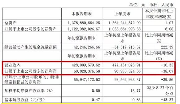 4月28日,剛剛公布一季報的浙江榮晟環(huán)保紙業(yè)股份有限公司,股價遭遇砸盤,開盤不久即跌停,最終股價收于40.30元,下跌4.48元,創(chuàng)一年來的股價新低。以老板馮榮華家族持股79475950股計算,一天時間身家跌去3.56億元。 行事不專業(yè)還是有意為之? 股價為何大跌,要從榮晟環(huán)保的一季度說起。 4月27日,榮晟環(huán)保發(fā)布2018年一季報,公司2018年1-3月實(shí)現(xiàn)營業(yè)收入4.28億元,同比下降10.35%;歸屬于上市公司股東的凈利潤6002.84萬元,同比下降38.07%。