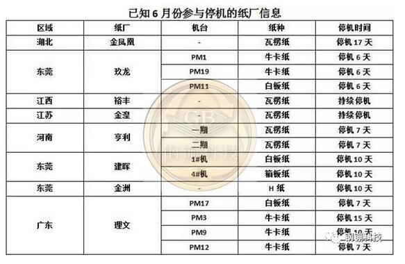 一、停機紙廠仍在增加,包裝紙機停產(chǎn)下半年可能很常見 據(jù)鋼镚科技統(tǒng)計,近日又有湖北金鳳凰紙業(yè)、江蘇金湟紙業(yè)、江西裕豐紙業(yè)發(fā)布6月停機計劃,其中湖北金鳳凰的瓦楞紙機將停產(chǎn)17天之久。通過對6月停機的生產(chǎn)線進行分析,小編發(fā)現(xiàn)此次停機首先是集中在以生產(chǎn)A級掛面箱板紙、白面/輕涂箱板紙以及灰底白板紙為主的生產(chǎn)線,隨后瓦楞紙生產(chǎn)線也受到影響。