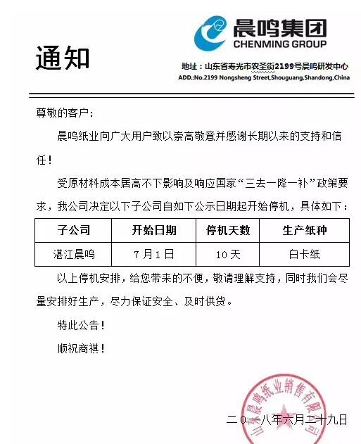 環保因素、成本上升導致供給端有所減弱,但是需求增速放緩幅度要更為明顯,這對生產企業而言,顯然不是什么好消息。面對持續陰跌的成品紙價格,各家龍頭紙企開始聯手保價,但是,“停產保價”短期內能起到的效果無非是止住跌勢,真正的轉機仍需等待需求端的明顯好轉。 晨鳴集團7月份再停白卡紙機!