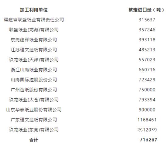 審批恢復正常,核定量創三個月新高 按正常進度,每個月固廢中心會在月中和月末公布兩次審批名單,但是六月份只公布了一次,而且廢紙核定量為0。因此,此次第15批名單公布放在月初(第一個工作日),可以看做是對六月份的一次補充。這次超過177萬噸的核定量,也是從4月份以來的新高。 但是,要強調的是,盡管這一次量很大,但是并沒有改變之前的供應規模。,在之前的文章已經提到過,今年每個月的廢紙平均審批量約200萬噸,5月份受海關臨時性措施的影響,下降比較多。 現在,審批量再次放大,應該是生態環境部、海關、檢驗檢疫公司、造紙企業和境外貿易商已經為新的進口流程做好了準備。 纖維補充量有折扣 本次名單中,理文在東莞的兩家企業廣東理文和東莞理文一共獲得了39萬噸的額度,但是這39萬噸同時標注了全部是屬于加工貿易,也就是說,用這些廢紙生產的原紙,將來將直接出口或者作為其他商品的包裝用于出口,而不能在國內銷售或使用。同樣的,東莞玖龍也有10萬噸額度屬于加工貿易。加工貿易的額度約占了總核定量的23%。 眾所周知,我國造紙行業缺乏原料,無論是進口的木漿還是廢紙,說白了都是補充國內造紙用的纖維,都是對國產造紙原料不足的補充。但是加工貿易的存在,就意味著本來進到國內可以循環使用的這部分纖維資源,在國內加工為成品紙后又流出了國內。因此,對國內的供應只能起到一時緩解,解決原料不足的根本方法還是要有大量的纖維原料從國外進口,并且要在國內實現循環使用才行。 TOP7占主導 截至已經公布的15批名單,一共有66家企業獲得進口許可,其中獲得許可量超過30萬噸的企業有12家,這12家的總核定量是971.6267萬噸,占總量的77%。 這12家中,玖龍有3家企業,理文有2家,山鷹有3家,再加上廣紙、華泰、建暉和聯盛,共有7家紙業集團,這其中又以玖龍、理文和山鷹為主。 由于這些企業可以獲得外廢的支持,因此這些企業將比其他企業在生產成本上有更大的優勢。這也可以看做是國家對大型企業做大做強的支持!