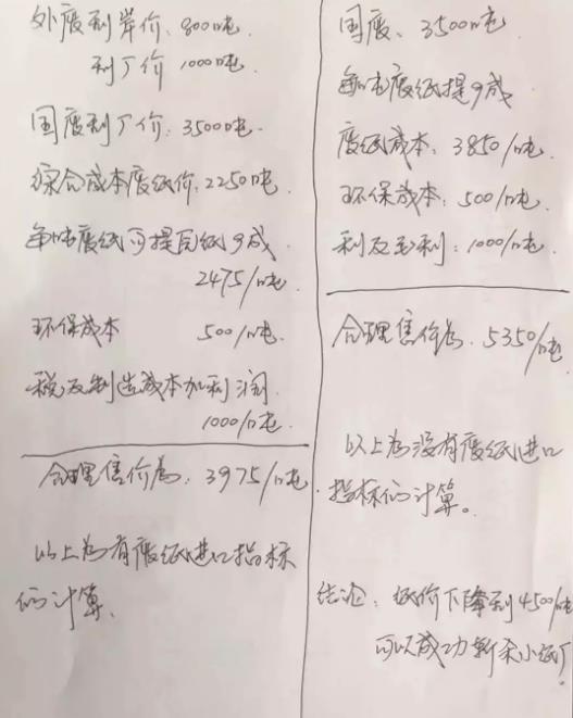 如上報價單,有行業(yè)朋友說比同行至少低了10%的,有說平米價差達到0.50元的。總之,這是一張石破天驚的行業(yè)超低價。其報價含稅,但做貨前提是——必須是預付款! 筆者做了一下測算,如果五層紙板(160+90+50+90+160)價差0.50元,其原紙均價會比一般紙板廠低多少? 上述紙板五層克重約622g,在報價毛利設定為15%的情況下,紙板價差0.50元,就相當于原紙價差約700元。 要知道,玖龍等大造紙廠,因為有便宜的外廢,按外廢、國廢各占50%的比例,與全部用國廢的造紙廠原紙售價之間的差價,會達到1400元左右。