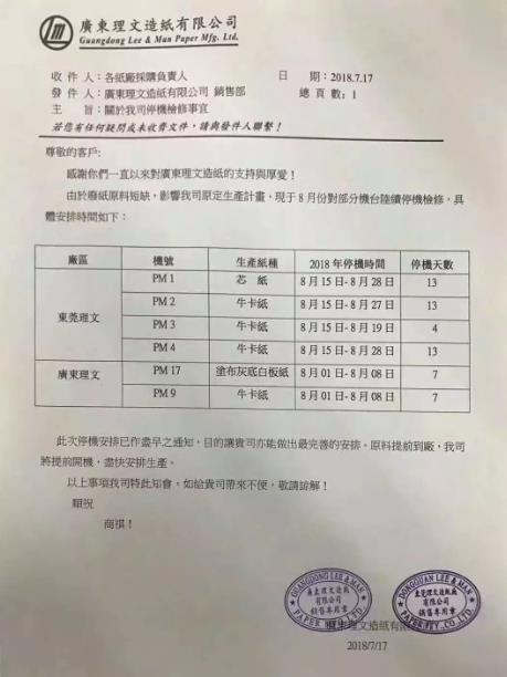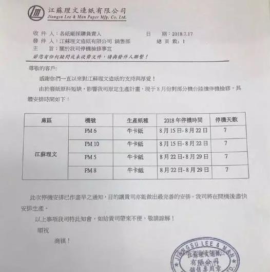 江蘇理文:8月15日起,生產(chǎn)牛卡紙的4臺紙機(jī)停機(jī)檢修7天。