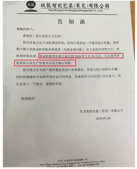 原料價格高就意味紙價高,隨著原料價格壓力的一路傳導,到最后是需要由消費者承擔,但國內生產的紙制品在某些方面具有可替代性,例如:紙包裝會被循環新材料所替代,亦或者被國外進口的紙制品所替代。這意味著消費者擁有者更多的選擇,而這最后導致受傷的可能不僅僅是下游紙箱、包裝廠。更可能是整個行業。 行業發展仍需上下游相互信任,共同努力 導致這一系列問題原因是什么?很大程度上還是原料。目前原料哪里來?上游的廢品收購站、打包站。 作為整個紙品產業鏈的上游,打包站的重要程度可想而知。據悉,某些紙廠對供應商所供應的廢紙進行可追溯標記。也就是說,雖然抽檢的時候打包摻假、摻雜沒有被發現,但是后續生產過程中發現是可以通過記錄追溯到供應商,進而影響到其信用評價。 還記得玖龍的低價紙嗎?7月24日,玖龍包裝發出最新告知函,表示:原試機接單價格只執行到2018年7月24日止,以后接單按正常生產價格并以雙方確認為準。