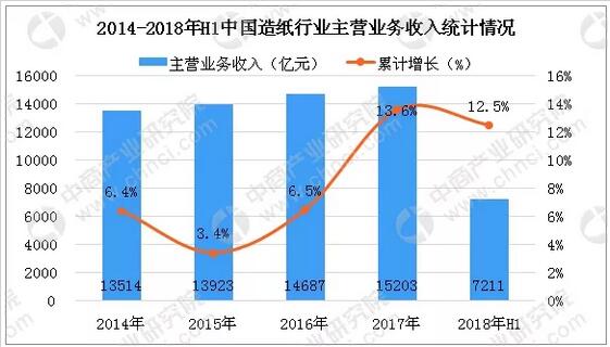根據中商產業研究院監測數據顯示,2018年上半年我國造紙行業規模以上企業實現主營業務收入7211億元,同比增長12.5%,達到2017全年主營收入的47.43%。回顧2014-2017年造紙行業營業收入情況:近四年來,我國造紙行業營業收入保持穩步上漲。