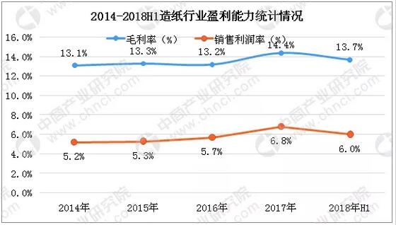 近年來,我國造紙行業盈利能力趨于穩定,2017年我國造紙行業毛利率達到14.4%,與上年相比提高1.2個百分點,造紙行業銷售利潤率達到6.8%。與上年相比造紙1.1個百分點。2018上半年造紙行業毛利率為13.7%,利潤率為6.0%。