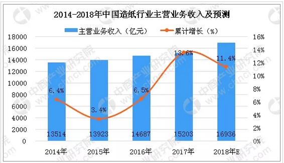 中商產業研究院數據庫數據顯示,2014年以來造紙行業營業收入保持穩步上漲。2017年主營業務收入為15203億元,相比2016年的14687億元增加了516億元,根據中商產業研究院預計,2018年中國造紙行業將繼續保持穩中有長趨勢。