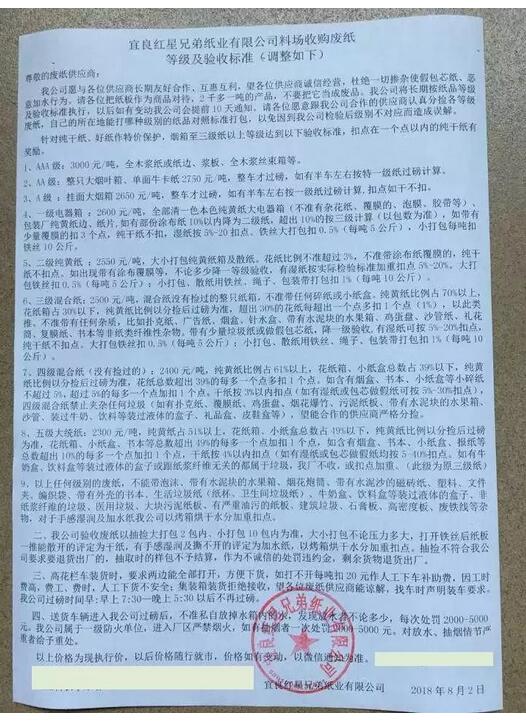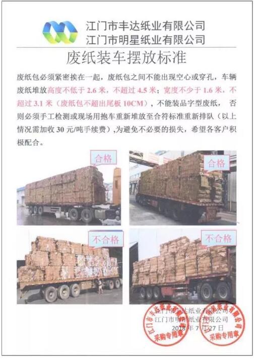 以上規定從2018年8月20日起,現場會嚴格按照此規定執行,近期請通知供應商做好通知落實。 這是玖龍紙業8月發布的第二份廢紙新標準,以下是8月7日版本: 一、各位供應商:8月7日起,往我司各基地發貨必須提前一天報備車號、等級、貨主姓名、供貨基地等信息,否則無法進廠! 具體操作如下:即8月8日到貨必須于8月7日下午14點之前將車號、貨物等級、貨主姓名、供貨基地等信息通過微信或短信等途徑發送給我,否則無法正常登記進廠!如有特殊情況可于第二天上午9點之前補充報備! 確保報備信息準確無誤,如果車牌號錯誤將無法登記進廠! 嚴禁虛假報備或者出現報備后不到貨的情況! 請各位供應商嚴格執行并相互轉告,以免造成到貨無法進廠的情況! 二、關于玖龍集團再次強調加強對外協車輛水箱放水檢查的通知: 1.往玖龍紙業各基地發貨,司機進廠前必須將加裝水箱里的水放完,否則禁止入廠! 2.若在廠內發現水箱里的水未放完,且未給我司造成損失的,將車輛和駕駛員列入黑名單并收取違約金1000元/次,造成損失的,還須全額賠償我司損失! 3.若發現外協車輛在廠內放水的,核查確為騙重的,將車輛和司機列入黑名單并罰款5000元,追究供應商責任! 請各位供應商和廣大司機朋友們嚴格按照我司要求執行! 山東世紀陽光 山東昌樂世紀陽光紙業紙箱的垃圾扣點標準: 以此為準,按照標準揀選: ①垃圾含量≤0.5%; ②0.5%<垃圾含量≤1.5%范圍,超出0.5%部分,全部扣除; ③1.5%<垃圾含量≤10%時,超出1.5%部分雙倍扣除;④垃圾含量>10%時,扣點50%; ⑤垃圾含量>15%時,扣點100%, 望各供應商嚴格控制好質量! 福建山鷹 各位供應商:大好!從8月1日起執行新的質量檢驗標準。新標準要求A、B、C、D、E五個等級的紙含雜率≤0%,含水率≤12%,請大家嚴格按標準分揀打包,敬請配合與支持,并互相轉告,謝謝! 江門明星紙業 廢紙包必須緊密挨在一起,廢紙包之間不能出現空心或穿孔,車輛廢紙堆放高度不低于2.6米,不超過4.5米;寬度不少于1.6米,不超過3.1米(廢紙包不超過尾板10cm),不能裝品字型廢紙,否則必須手工監測或現場用抱車重新堆放至符合標準重新排隊(以上情況需加收30元/噸手續費)。