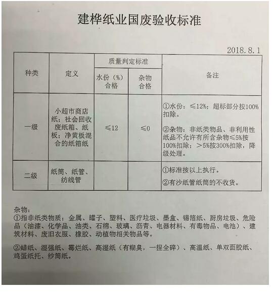 東莞建樺紙業 8月1日起,執行廢紙回收新標準,要求水分不能超過12%,雜物不得超過0%。