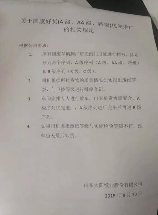 山東太陽紙業發布最新廢紙要求規定