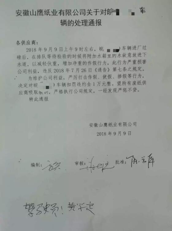 9月9日,安徽山鷹紙業(yè)有限公司關(guān)于對(duì)供應(yīng)商違規(guī)作假,增加凈重的車(chē)輛處理通報(bào),并對(duì)違規(guī)車(chē)輛扣罰違約金一萬(wàn)元。