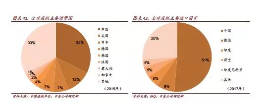 二、調研:國廢價格持續走冷,打包站出貨心理悲觀 9月末國廢價格大幅下調后,雖10月初價格有一定的回升,但是仍未達到之前的高點。為了了解現階段各打包站的出貨狀況,小編特地調研了一些打包站。 此次調研包括浙江、河南、江西、湖北、江蘇等地的一共13家打包站。其中月收貨量500噸以下的有7家,500噸至1000噸的有3家,1000噸以上的有3家。 出貨情況:在這13家打包站中,有11家基本沒有囤貨,有2家有一定的囤貨。但是面對現在變化不定的行情,所有的打包站無一例外選擇了快進快出。兩家有存貨的打包站也向小編表示之前不該囤貨,沒有及時出手。之前突然的價格崩盤讓打包站的經營者惶惶不可終日,在價格略有回升后,都選擇了拋貨即時止損。對于之后的行情走向,他們多是持悲觀態度,認為價格難以反彈。 綜上所述:按照以往的經驗,從業者會在價格上調時選擇囤貨。但是此次的價格跌幅超出想象,即使有不小的回升,仍未消除打包站經營者的恐慌心理。特別是近期利空消息層出不窮,從不斷升級的中美毛衣戰,到10月18日突然而至的第22批總計200萬噸的外廢批文。下游成品紙的市場情況本來就不甚理想,此次新增的200萬噸外廢更是成為壓死上游國廢價格的最后一根稻草。市場內憂外患,受到直接沖擊的打包站自然不敢再囤積居奇,縱使需要割肉拋貨,但是為了生存下去,別無選擇。近幾日的國廢價格仍有走低的趨勢,各打包站的冬天可能要提前來臨了。 北方昨日三大玖龍基地部分等級下調30-50,帶動周邊以河北為主的多數廠家普跌50。山東地區以德州、濰坊匯勝為主不少廠家下調50,市場補跌明顯。南方華東昨日基本維穩,浙江零星小廠調整自身,福建漳州山鷹上調50,其余廠家多維穩觀望。10月19日最高下調100元/噸,最高上調60元/噸,廢紙指數2211.27,環比下調0.36%。華東地區下調30-100元/噸,浙江有上調。華南地區下調30元/噸。 山東: 山東鄒城太陽宏河紙業,廢紙價格下調60元/噸,C級下調100元/噸。 山東聊城中治銀河紙業,廢紙價格下調50元/噸。 山東泰安泰和紙業,箱板紙價格下調40元/噸。 浙江: 浙江嘉興山鷹(吉安)紙業,白廢類上調60元/噸。 浙江嘉興景興紙業,辦公廢紙上調60元/噸。 浙江臺州森林紙業,廢紙價格下調50元/噸。 浙江臺州欣榮紙業,廢紙價格下調50元/噸。 福建: 福建泉州玖龍紙業,黃紙價格下調50元/噸(D級不變)。 福建漳州盈晟紙業,國廢下調50元/噸。 福建漳州三星紙業,廢紙價格下調50元/噸。 福建漳州港興紙業,廢紙價格下調50元/噸。 福建漳州聯盛紙業,黃板類下調30元/噸,白廢不變。 福建漳州華發紙業,廢紙價格下調50元/噸。 江蘇: 江蘇宿遷上善紙業,廢紙價格下調50元/噸。 廣東: 廣東東莞雙洲紙業,廢紙價格下調30元/噸。 三、數據說話:廢紙未來走勢,主基調穩中向上 因趨嚴的廢紙進口限制,國、內外廢紙價格分化,國產廢紙價格變動更多服從國內供需。預計2018~2020年我國進口量大幅下滑,回收量增長難以補足缺口,廢紙整體供給減少;同時我國廢紙消費已經穩定,增量有限。整體看,國產廢紙處于供不應求的局面,長期價格中樞穩中向上。 1.內外價格分化,國產廢紙價格服從國內供需 不同于紙漿(木漿+非木漿),近年來我國進口廢紙受到明顯的政策監管。其中,2017年7月中國正式向WTO發出通知,自2018年不再進口混雜廢紙;2018年3月中國將進口廢紙中混雜物比重標準從1.5%下調為0.5%,對進口廢紙質量要求再度提高,在進口政策的監管下,國內外廢紙價格開始出現分化。考慮未來中國收緊廢紙進口量是大概率事件,行業使用國產廢紙的比例將不斷提高,同時國內外廢紙價格分化持續,國產廢紙價格將更多考慮國內供需變動。  2.廢紙進口持續收緊,國產廢紙增量有限 根據中國造紙年鑒數據,2015年全球廢紙總回收量2.41億噸,同比增長1.8%,且近年來回收量同比增速較穩定。 中國、美國是全球前兩大廢紙生產國,產量占比均為20%,這主要源于兩國造紙產量高,廢紙來源多。從貿易格局看,美國是最大的廢紙出口國,美國出口量占全球總出口量比高達32%,同時日本、歐洲也是重要的廢紙出口地。相比下,中國廢紙消耗量大于產量,廢紙自用尚不足,不具備出口能力。  2017年中國廢紙回收量約5,000噸,同比增長0.7%。雖近年來國產廢紙回收量持續提升,但仍難滿足自用,廢紙自給率僅為63.8%。廢紙回收率較低是國產廢紙供不應求的重要原因,我國廢紙回收率僅為47%,明顯低于美、日、歐等地60%以上的廢紙回收率水平。 而回收率差距的核心原因在于我國廢紙回收體系尚不健全,存在網絡不夠全面、行業集中度低且中小企業經營能力差、行業缺乏統一標準等諸多問題。向前看,我們預計未來我國回收率仍有廣闊提升空間,其一在于受益于政策傾斜,我國廢紙回收體系將繼續完善,根據《再生資源回收體系建設中長期規劃(2015年~2020年)》及《關于推進再生資源回收行業轉型升級的意見》,預計2020年我國廢紙回收量提升至5500萬噸,對應回收率50%;其二考慮當前國產廢紙價格同比升高,廢紙回收行業的盈利水平因此提高,也將刺激廢紙回收業的發展。