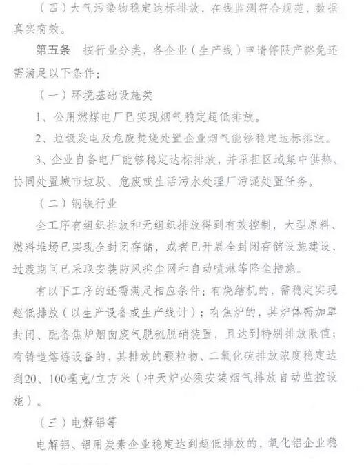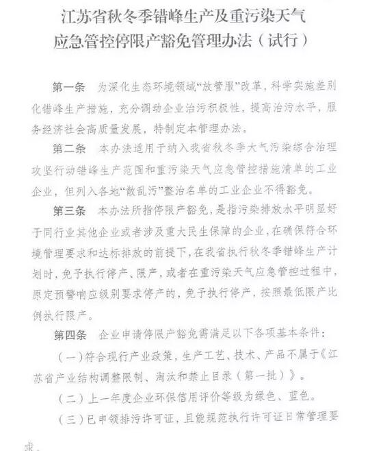 《江蘇省秋冬季錯峰生產(chǎn)及重污染天氣應(yīng)急管控停限產(chǎn)豁免管理辦法(試行)》在今年10月16日正式出臺,辦法明確污染排放水平偏好、涉及重大民生保障、符合環(huán)境管理要求、排放達標(biāo)、以及高質(zhì)量發(fā)展的企業(yè),在江蘇省執(zhí)行秋冬季錯峰生產(chǎn)計劃時,或者在重污染天氣應(yīng)急管控過程中,可申請停限產(chǎn)豁免資格。 《江蘇省秋冬季錯峰生產(chǎn)及重污染天氣應(yīng)急管控停限產(chǎn)豁免管理辦法(試行)》10月16日正式出臺,辦法明確污染排放水平明顯好于同行業(yè)其他企業(yè)或者涉及重大民生保障的企業(yè),在確保符合環(huán)境管理要求和達標(biāo)排放的前提下,在江蘇省執(zhí)行秋冬季錯峰生產(chǎn)計劃時,免予執(zhí)行停產(chǎn)、限產(chǎn),或者在重污染天氣應(yīng)急管控過程中,原定預(yù)警響應(yīng)級別要求停產(chǎn)的,免予執(zhí)行停產(chǎn),按照最低限產(chǎn)比例執(zhí)行限產(chǎn)。 本辦法的出臺,是江蘇省環(huán)保廳深化生態(tài)環(huán)境領(lǐng)域“放管服”改革,科學(xué)實施差別化錯峰生產(chǎn)措施,引導(dǎo)企業(yè)主動治污,實現(xiàn)經(jīng)濟高質(zhì)量發(fā)展的重要舉措。根據(jù)這項政策,符合申請停限產(chǎn)豁免條件的企業(yè)類型將在下文詳細闡述。 企業(yè)申請停限產(chǎn)豁免需滿足特定條件 企業(yè)申請停限產(chǎn)豁免,除了需滿足產(chǎn)業(yè)政策、環(huán)保信用等級、排污許可證以及穩(wěn)定達標(biāo)排放四項基本條件,按照環(huán)境基礎(chǔ)設(shè)施類、鋼鐵行業(yè)、水泥行業(yè)、建材行業(yè)(含工業(yè)窯爐)、電解鋁等行業(yè)、石化行業(yè)以及其他行業(yè)等七類,滿足特定的行業(yè)豁免條件。 政策正向激勵企業(yè)獲得停限產(chǎn)豁免 按照以往錯峰生產(chǎn)和重污染天氣應(yīng)急管控要求,停限產(chǎn)措施都是針對行業(yè)來實施,未體現(xiàn)行業(yè)內(nèi)部不同治理水平企業(yè)之間的差異性,以鋼鐵行業(yè)為例,本辦法明確燒結(jié)生產(chǎn)線穩(wěn)定實現(xiàn)超低排放的,就可以予以豁免,這樣就使得企業(yè)會主動加快超低排放改造進度,爭取獲得停限產(chǎn)豁免。 民生關(guān)切的企業(yè)被優(yōu)先予以停限產(chǎn)豁免 對涉及供暖等重大民生關(guān)切的企業(yè),予以豁免,對公用燃煤電廠已實現(xiàn)煙氣穩(wěn)定超低排放的,予以豁免,對垃圾發(fā)電及危廢焚燒處置企業(yè)煙氣能夠穩(wěn)定達標(biāo)排放的,予以豁免。 高質(zhì)量發(fā)展企業(yè)均可申請停限產(chǎn)豁免 一方面,屬于戰(zhàn)略新興產(chǎn)業(yè)的企業(yè),滿足環(huán)保基本要求的,均可以申請豁免,另一方面對于列入“散亂污”整治名單的工業(yè)企業(yè),不能予以豁免,生產(chǎn)工藝、技術(shù)、產(chǎn)品屬于《江蘇省產(chǎn)業(yè)結(jié)構(gòu)調(diào)整限制、淘汰和禁止目錄》的,也不能予以豁免。