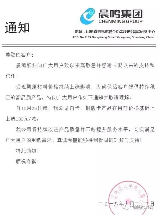 晨鳴集團(tuán) 自10月26日起,白卡、銅版卡產(chǎn)品在目前價(jià)格基礎(chǔ)上上調(diào)100元/噸。