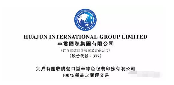 2018年11月9日,華君國(guó)際集團(tuán)發(fā)布公告稱,已完成有關(guān)收購(gòu)營(yíng)口益華綠色包裝印務(wù)有限公司100%權(quán)益之關(guān)連交易。