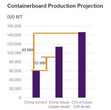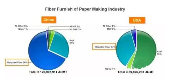 紙種結構差異、中國的原料供應量不足,中美原料差距巨大 首先紙種結構存在差異。 包裝紙占紙業總產量比例極高,因此我們可以將模型簡化為分析包裝紙。中國箱板紙、瓦楞紙、二次纖維產涂布紙板及未涂紙板產量占據總體紙板產量的85%左右,而這些紙種幾乎清一色使用二次纖維(由于強度、遮蓋性等要求,也會少量加入一次纖維),這也就難怪中國的造紙產業對于廢紙原料的依存度如此之大。 出現這種現象,一方面是由于國人對紙張質量的認知及需求還沒有上升到足夠高度,另一方面整個造紙行業在商業模式上仍然走著降低成本賺取利潤的老路。