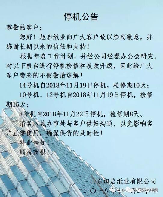 11月20日,山東旭啟紙業(yè)有限公司發(fā)布停機(jī)公告,宣布4臺(tái)紙機(jī)自11月19日起停機(jī)檢修8-15天: 14號(hào)機(jī)自2018年11月19日停機(jī),檢修期10天; 10號(hào)機(jī)、12號(hào)機(jī)自2018年11月19日停機(jī),檢修期15天; 8號(hào)機(jī)自2018年11月22日停機(jī),檢修期8天。