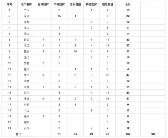 布局方案: 在2019~2023年5年內(nèi),共規(guī)劃建設(shè)廣東省治理超限超載非現(xiàn)場(chǎng)執(zhí)法監(jiān)測(cè)點(diǎn)362個(gè)。其中,規(guī)劃建設(shè)省界防護(hù)點(diǎn)31個(gè)、市界防護(hù)點(diǎn)94個(gè)、源頭管控點(diǎn)29個(gè)、重要橋隧檢測(cè)點(diǎn)46個(gè)、咽喉要道檢測(cè)點(diǎn)162個(gè)。 布局方案統(tǒng)計(jì)表: