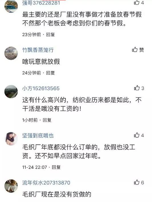 網(wǎng)友:服裝放假早,我們雙十一后就開始賣庫存清貨,不讓廠里做貨了,賣完放假,年后就開始做新款春款了! 網(wǎng)友:計件工廠慣用伎倆,回來人去樓空。做了十幾年的老工人將損失幾萬。因為如果裁員的話會補工資,好像是做滿一年補一月! 網(wǎng)友:現(xiàn)在毛織行業(yè)冷談,好多廠都沒貨做,我在中山這邊也放假了,一年就六七個月是旺季,真的不想再干毛織這行了! 網(wǎng)友:我們廠12月20日前,除了守廠人員,全部放假。到目前為止,8月份工資都未收到,押了好幾個月工資了,明年可能要4月份才開工。明年打算找別的廠了! 網(wǎng)友:說不定等到年后回來上班,大家連工廠都找不到了,因為老板趁大家休假的時候把廠都已經(jīng)搬空了,卷款逃跑了,這也不是不可能的事,大家還是多留個心眼兒吧,最好是休假期間能夠安排人盯著工廠和老板的動向吧!