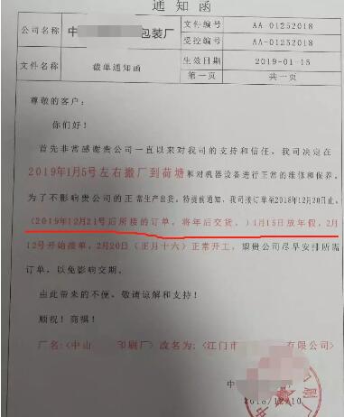 導語:12月10日,廣東中山一家紙箱廠發布一份截單通知函,該紙箱廠表示,由于公司決定在2019年1月5日左右搬廠,并對機器設備進行正常的維修和保養,公司接訂單至2018年12月20日止。 廣東一紙箱廠發出春節放假通知! 今年冬天很冷,不是天氣冷,是市場冷!現在離春節還有將近2個月,紙箱廠最早也就提前1個月放假,今年卻有企業早早地發出了春節放假通知。 12月10日,廣東中山一家紙箱廠發布一份截單通知函,該紙箱廠表示,由于公司決定在2019年1月5日左右搬廠,并對機器設備進行正常的維修和保養,公司接訂單至2018年12月20日止。2018年12月21日后所接訂單,將年后交工。2019年1月15日開始放年假,2月12號開始接單,2月20日正式開工。