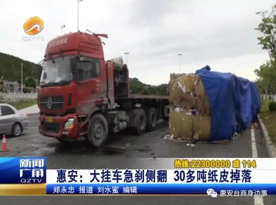 12月11日上午,泉州市惠安縣城至動車站快速通道上,一輛大掛車側(cè)翻,車上的幾十噸貨物傾倒在路中央,所幸事發(fā)時沒傷及其它過往車輛。 事故地點位于惠安縣城至動車站快速通道壩下村路段。記者到達(dá)現(xiàn)場時,大掛車已經(jīng)被吊起扶正,但象小山似的貨物還末清理,這些占據(jù)了近兩個車道的貨物是一些廢紙皮,前往惠安動車站和泉州方向的車輛只好減速慢行。大掛車司機介紹,車上裝載的廢紙皮有30多噸,打算從福州運往漳州一家造紙廠,清晨五點多,行駛到此處時,由于司機路況不熟,導(dǎo)致事故發(fā)生。  (記者):怎么側(cè)翻了? (大掛車司機陳師傅):就是那邊路面不平,有點溝,然后這樣打方向車子晃動,就翻了。 車子側(cè)翻后,陳師傅從車窗里爬出,所幸只是輕微受傷。他脫困后,一邊打電話給公司,一邊聯(lián)系救援車輛。上午九點多,大吊車來到現(xiàn)場,將大掛車吊起扶正,但由于車輛受損無法繼續(xù)行駛,只能等待公司派車來轉(zhuǎn)移貨物。據(jù)一旁的大吊車紀(jì)師傅介紹,這個路口彎太大,不熟悉路況的大貨車司機,一急打方向就容易發(fā)生側(cè)翻。