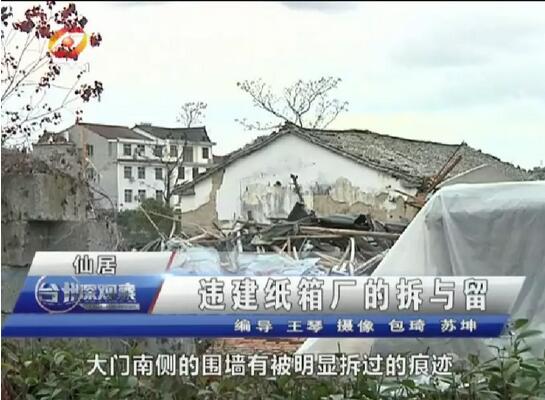 仙居縣南峰街道城建辦副主任陳澄非:它其實(shí)也是一次整體拆違的一部分,拆的時候我們是區(qū)分現(xiàn)行違建和歷史違建,它那個現(xiàn)在沒有拆完的房子,其實(shí)是它村里面一直存在的村里面的公房,權(quán)屬是屬于村集體的。違建性質(zhì)屬于歷史違建。 陳澄非說,在11月16日當(dāng)?shù)亟M織的集中拆違行動中,按照分類處置原則,街道拆除的那部分,是該紙箱廠今年新增的違建,而余下這棟,屬于歷史違建,對此,同時參與拆除行動的南峰國土資源分局也給出了同樣的說法。