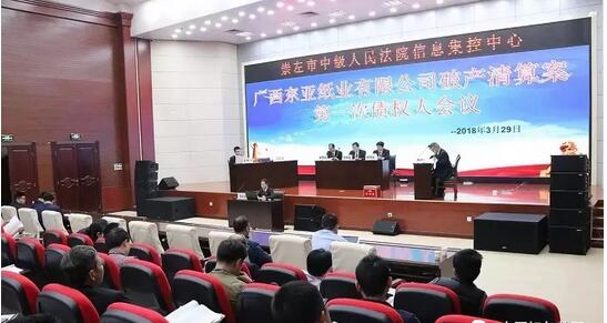 2、廣西東亞紙業(yè)有限公司 2018年3月29日,崇左市中級人民法院召開廣西東亞紙業(yè)有限公司破產(chǎn)清算第一次債權(quán)人會議。崇左中院執(zhí)行局在執(zhí)行申請人崇左桂南農(nóng)商行與被執(zhí)行人東亞紙業(yè)公司金融借款合同糾紛一案中,崇左桂南農(nóng)商行以東亞紙業(yè)公司不能清償?shù)狡趥鶆?wù),明顯缺乏清償能力為由,向該局申請將案件移送破產(chǎn)審查。 經(jīng)初步審查,截止2018年3月14日,東亞紙業(yè)公司共有債權(quán)人60人,向管理人申報債權(quán)77筆,申報債權(quán)總額共計3.9110億元。截止2016年10月,該公司資產(chǎn)評估值為3.0709億元,清算價值(司法處置價值)2.8897億元。