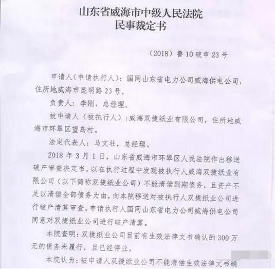 3、威海雙捷紙業(yè)有限公司 2018年3月1日,山東省威海市環(huán)翠區(qū)人民法院作出移送破產(chǎn)審查決定書,以在執(zhí)行過程中發(fā)現(xiàn)被執(zhí)行人威海市雙捷紙業(yè)有限公司不能清償?shù)狡趥鶆?wù),且資產(chǎn)不足以清償全部債務(wù)為由,向山東省威海市中級人民法院移送對被執(zhí)行人雙捷紙業(yè)公司進行破產(chǎn)清算審查。 2018年7月10日,山東省威海市中級人民法院作出(2018)魯10破申23號民事裁定書,裁定受理債務(wù)人威雙捷紙業(yè)有限公司破產(chǎn)清算一案,并于2018年7月17日作出(2018)魯10民轄47號民事裁定書,裁定本案由威海市環(huán)翠區(qū)人民法院審理。